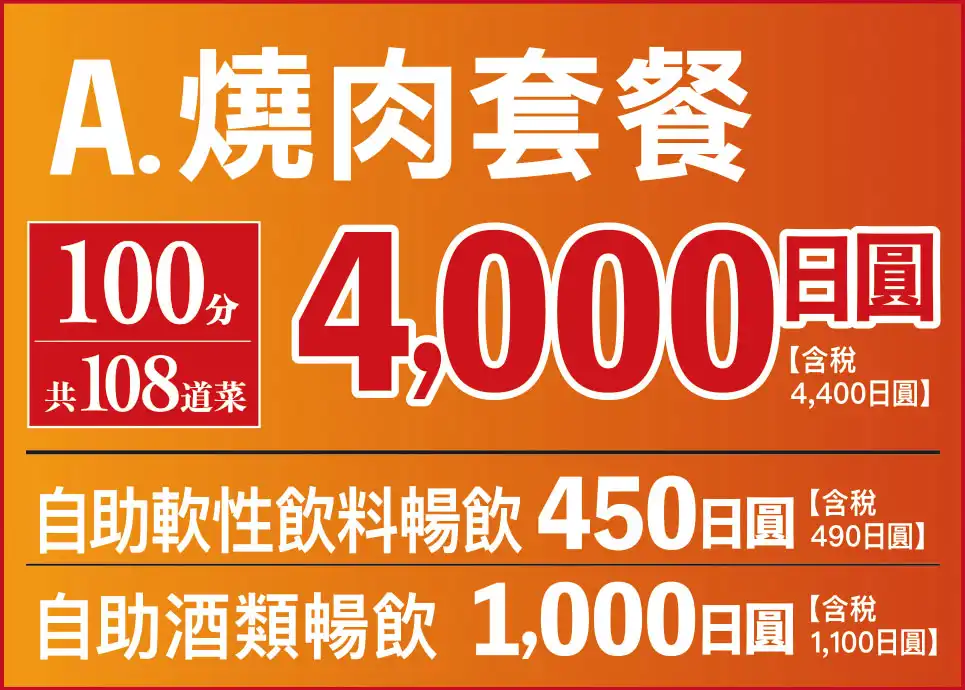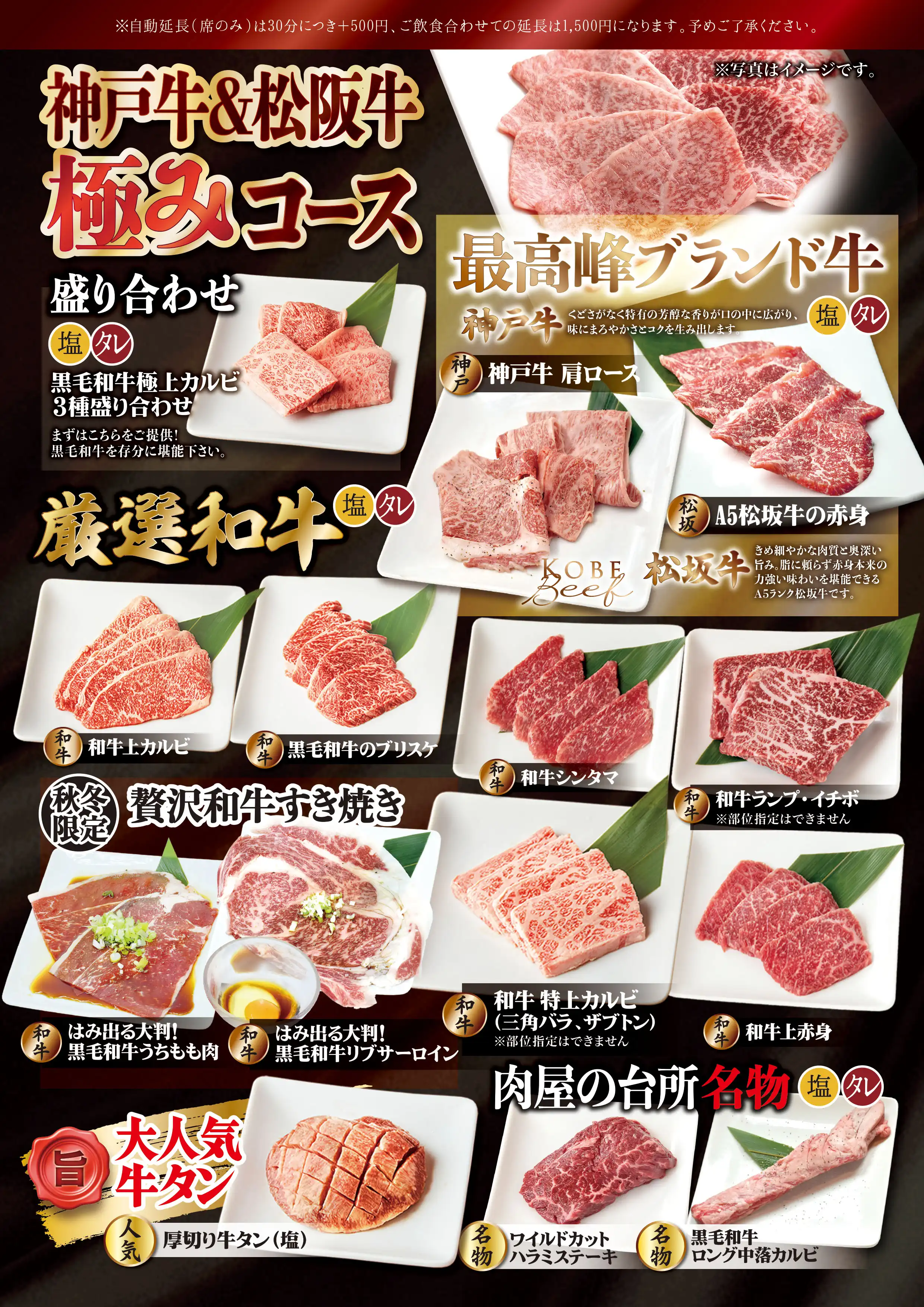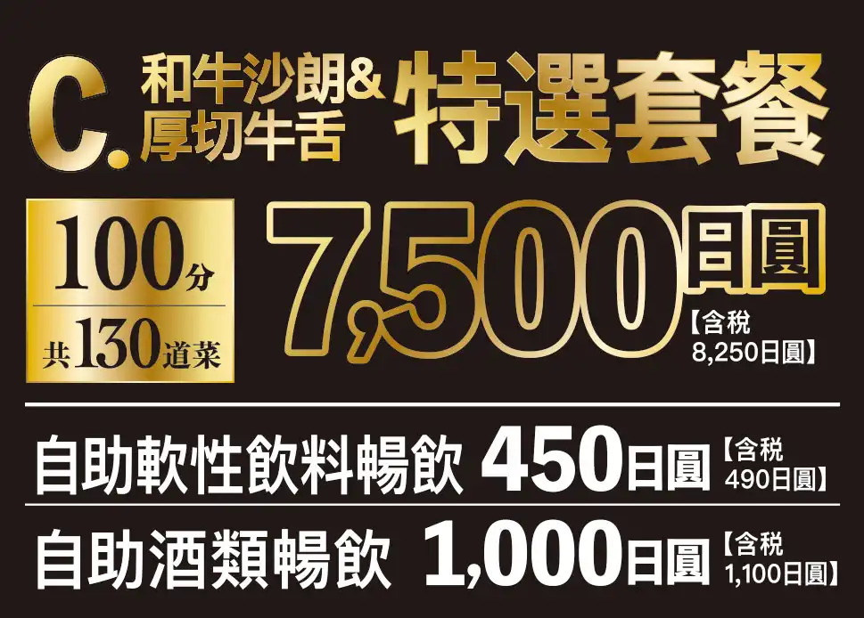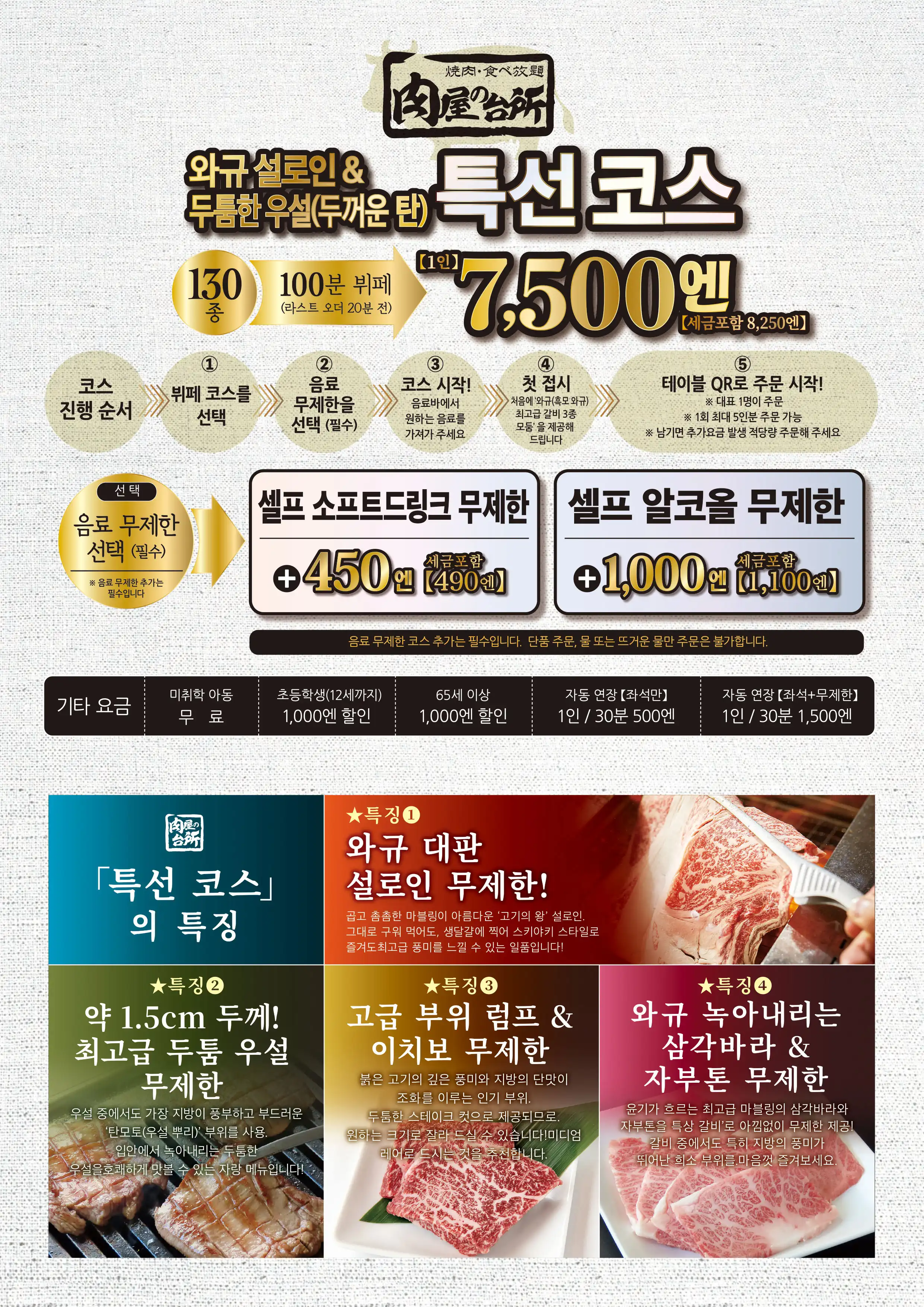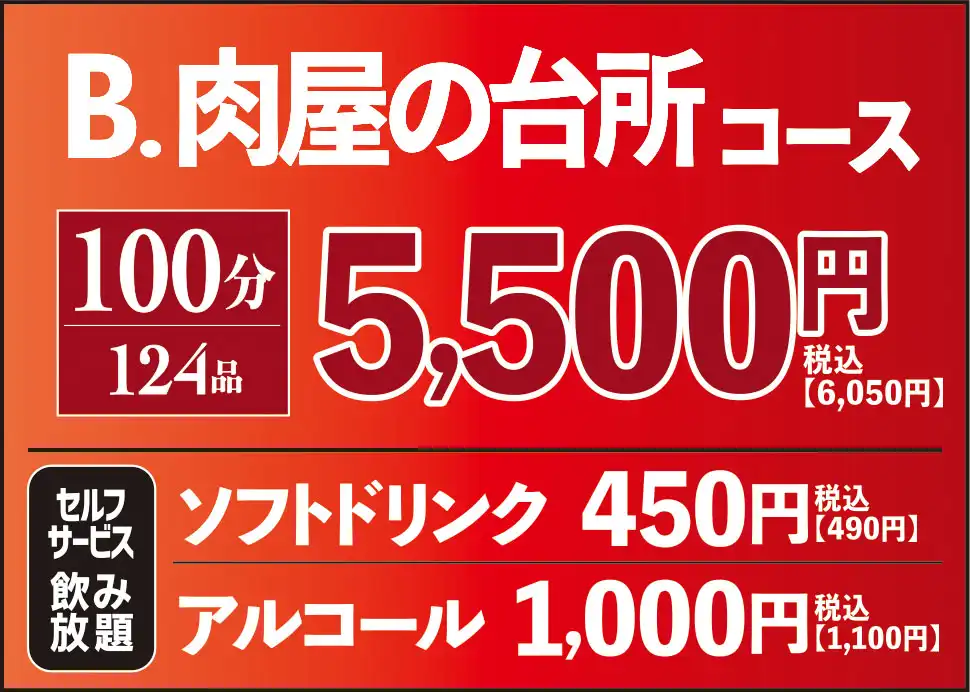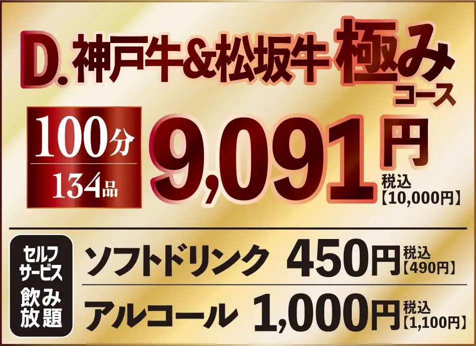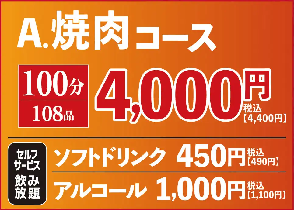 高級部位である黒毛和牛ランプやイチボ、きめ細かい霜が降った黒毛和牛サーロイン、圧倒的迫力のとろける厚切り牛タンなどが全て食べ放題に含まれる高級感あふれるコースです。事前予約で和牛肉パフェを無料サービスしております。ご希望のメッセージを添えて大切な記念日を彩ります。席時間100分制LO80分ーーーーーー【飲み放題料金】※必ずつけていただいており、詳細は当日ご案内させていただきます。(通常価格)ソフトドリンク450円(税込490円)アルコール:1,000円(税込1,100円)(LINE友達価格)ソフトドリンク350円(税込380円)アルコール:750円(税込820円)
