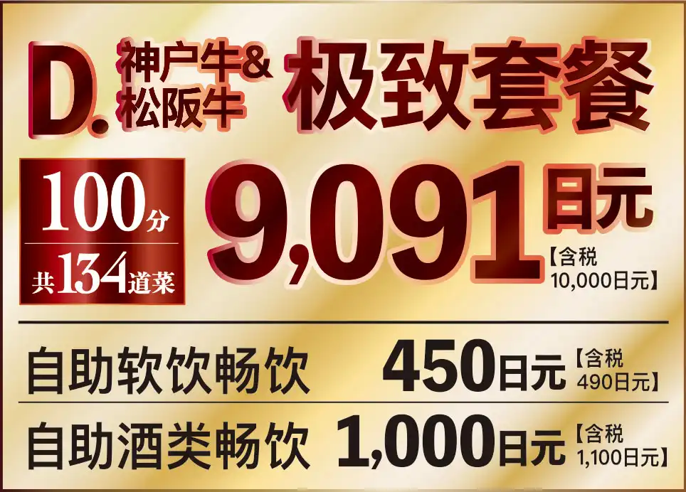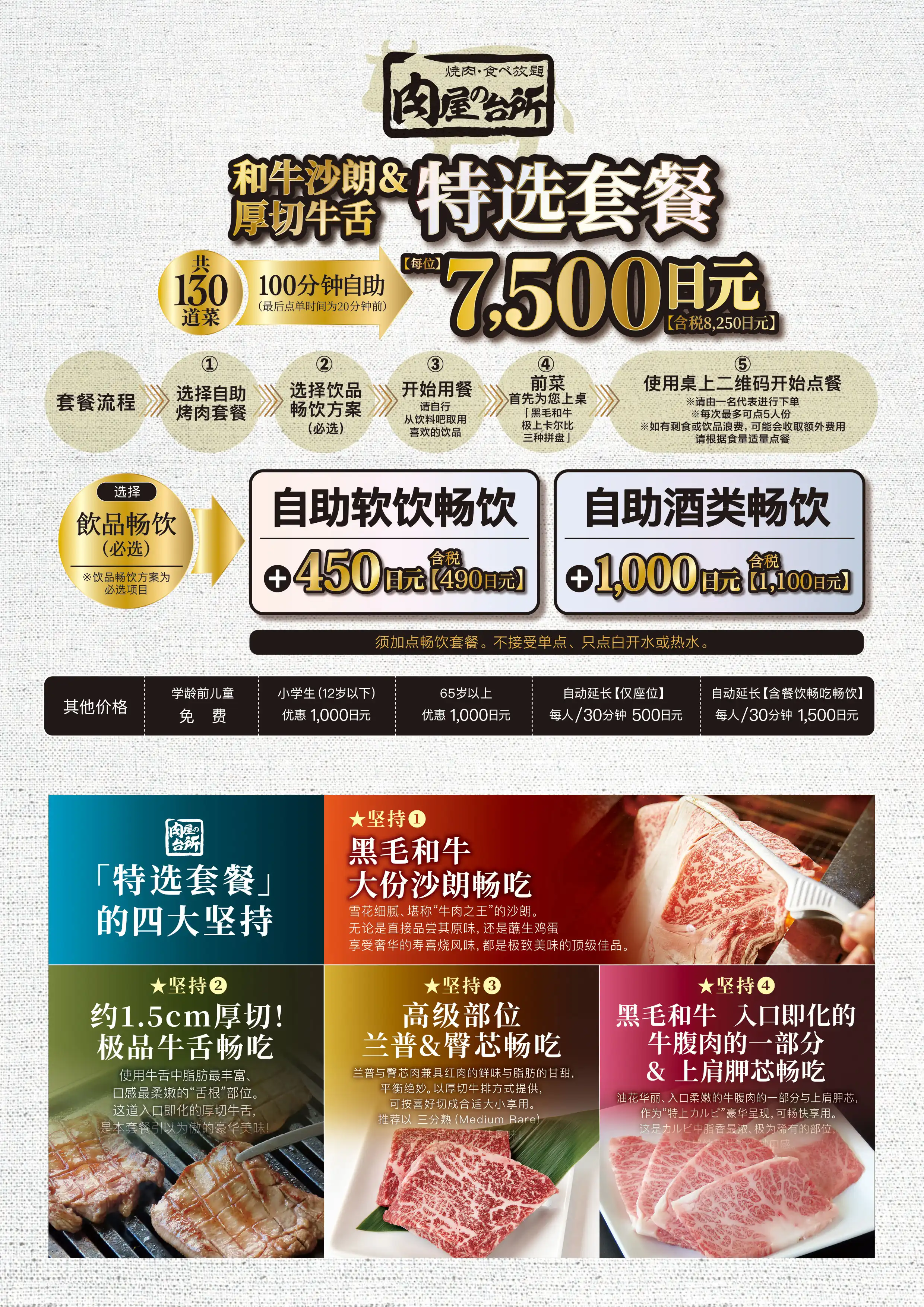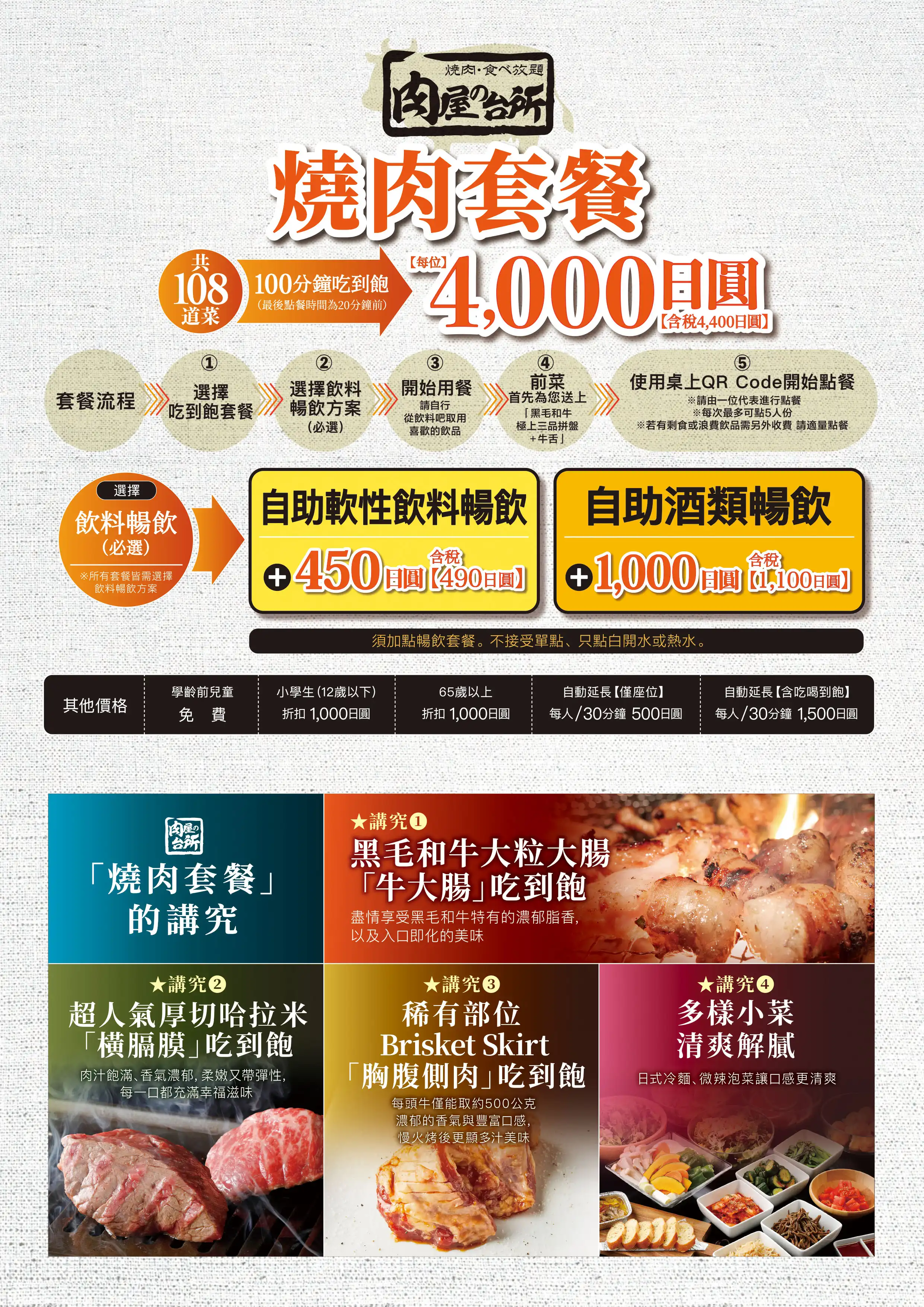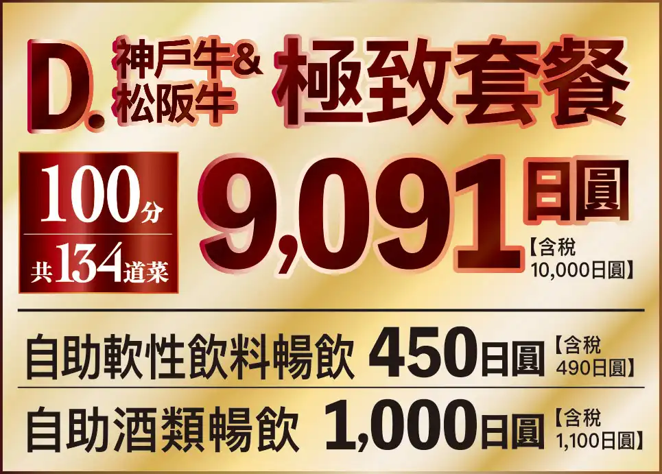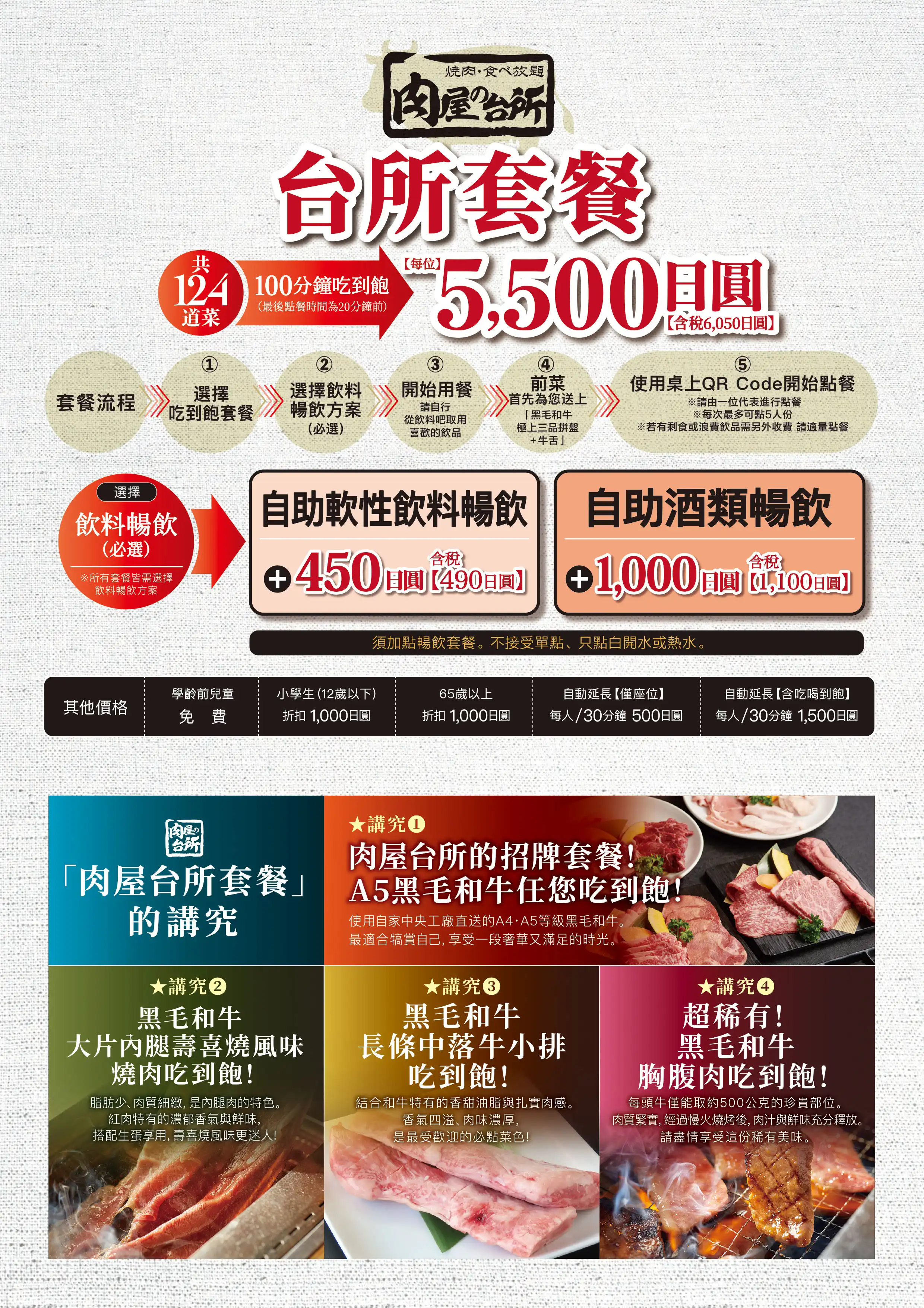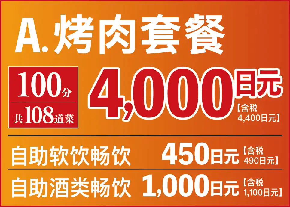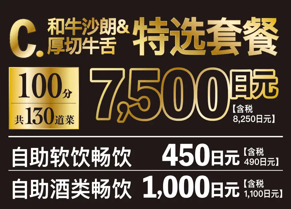 高級部位である黒毛和牛ランプやイチボ、きめ細かい霜が降った黒毛和牛サーロイン、圧倒的迫力のとろける厚切り牛タンなどが全て食べ放題に含まれる高級感あふれるコースです。事前予約で和牛肉パフェを無料サービスしております。ご希望のメッセージを添えて大切な記念日を彩ります。席時間100分制LO80分ーーーーーー【飲み放題料金】※必ずつけていただいており、詳細は当日ご案内させていただきます。(通常価格)ソフトドリンク450円(税込490円)アルコール:1,000円(税込1,100円)(LINE友達価格)ソフトドリンク350円(税込380円)アルコール:750円(税込820円)