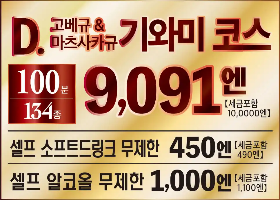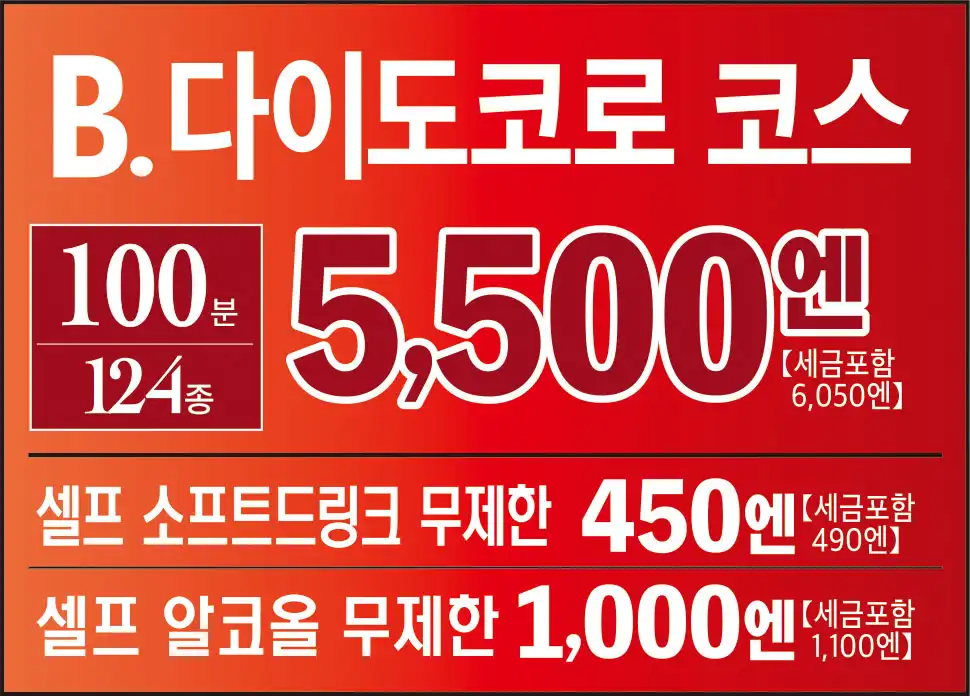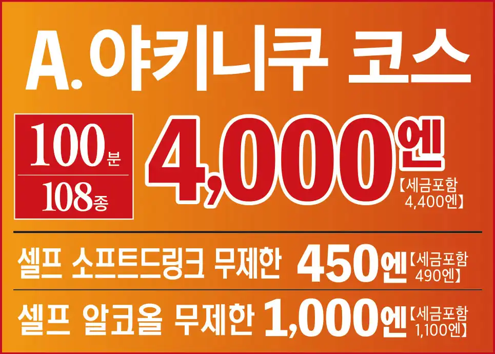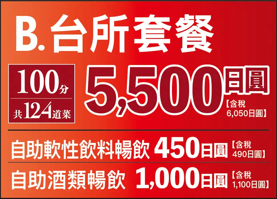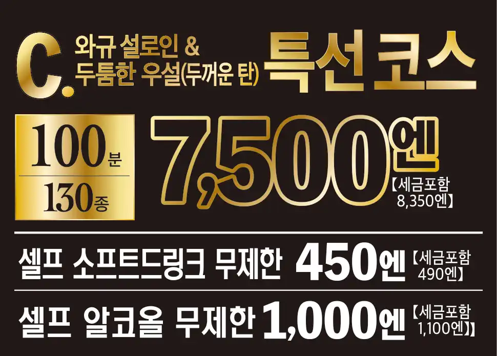 席時間100分制LO80分ーーーーーーーー【飲み放題料金】※必ずつけていただいており、詳細は当日ご案内させていただきます。(通常価格)ソフトドリンク450円(税込490円)アルコール:1,000円(税込1,100円)(LINE友達価格)ソフトドリンク350円(税込380円)アルコール:750円(税込820円)